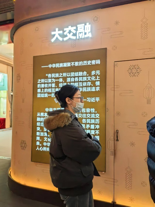 本次展览分为“大一统”“大交融”“大团结”三个单元。民族文化宫讲解员为大家介绍了我国古代各个政权由个体走向统一的全过程,大家通过倾听各民族交往交流交融的史实,沉浸式体验着我国独特的多民族文化,感悟中华民族大团结的深邃思想。展览紧紧围绕铸牢中华民族共同体意识主线,从历史、文化、经济等多个维度,展现中华民族凝聚不散和各民族共同体形成发展的历史长卷。