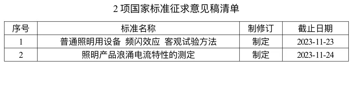 由全国照明电器标准化技术委员会归口并执行的《普通照明用设备 频闪效应 客观试验方法》等2项国家标准现已形成标准征求意见稿。现将该2项标准征求意见稿向社会公开征求意见(详见下表),为保证标准质量,请相关单位和专家提出宝贵意见。标准文本及相关编制说明见附件1。